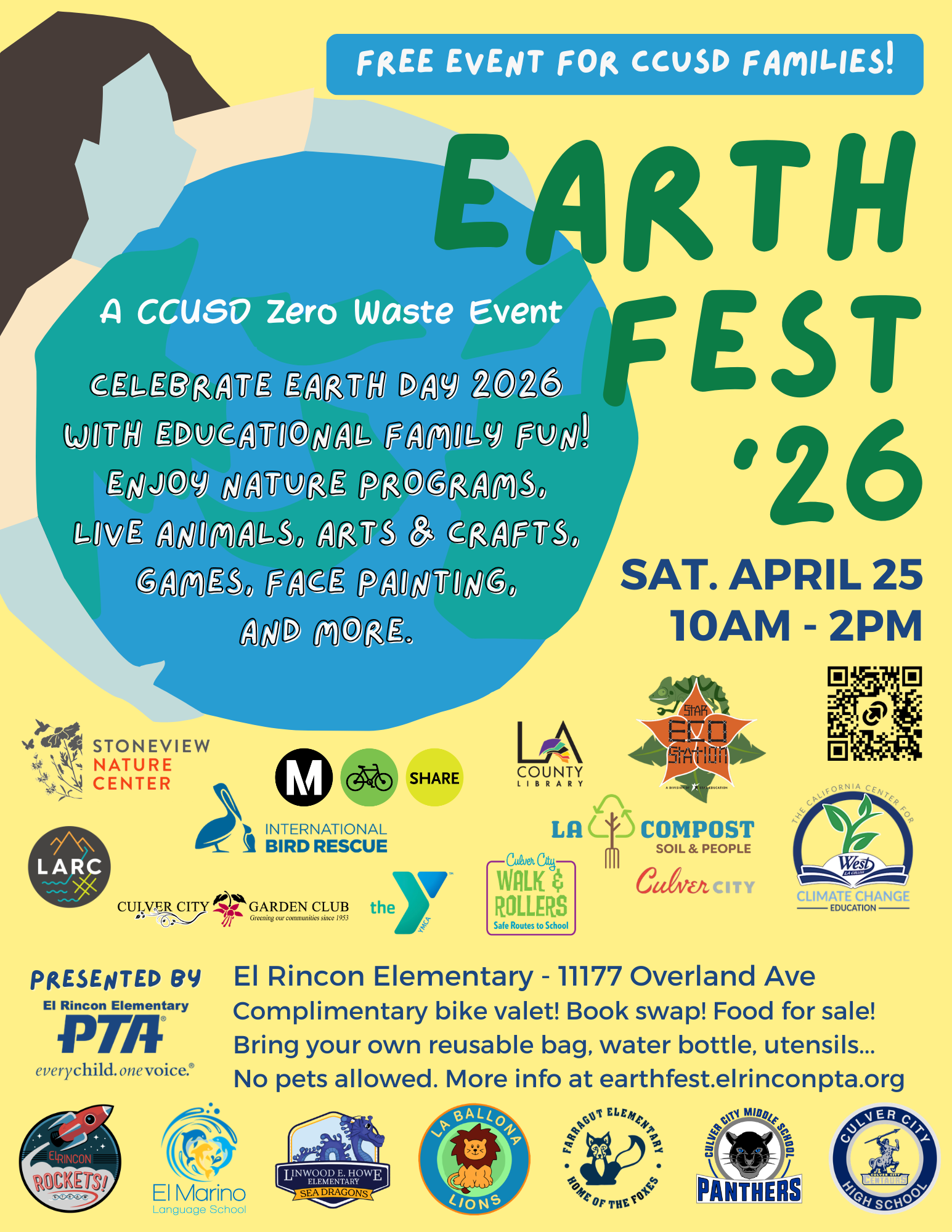 Earth Fest is a Zero Waste Event! Please bring your own reusable bag to hold your creations and prizes, water bottle to fill at our water stations, cup for other beverages, and any utensils you may need for the pupusa, taco, and lumpia food trucks.