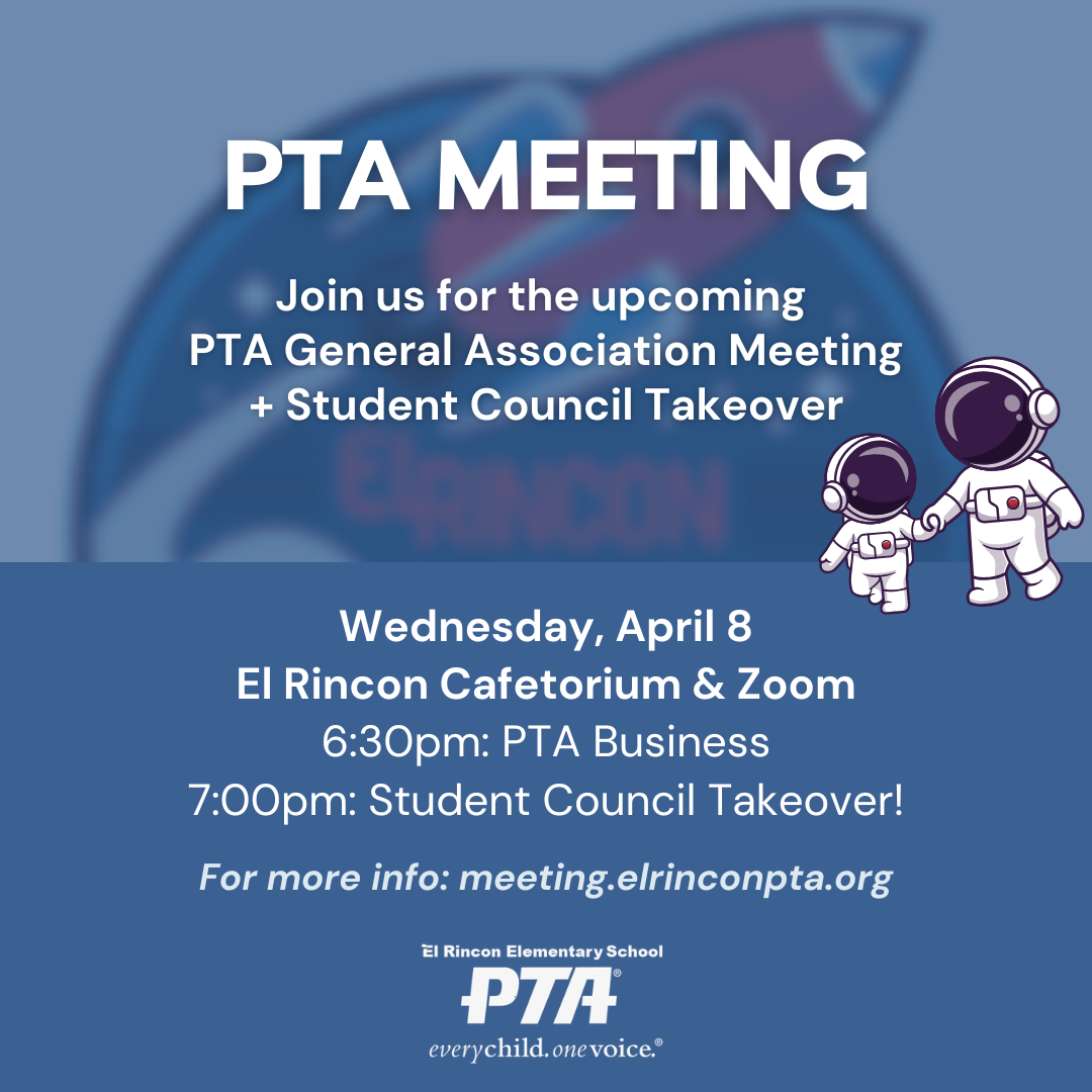 The next PTA General Association meeting will be on Wednesday, April 8 at 6:30pm in the Cafetorium with a Zoom option.